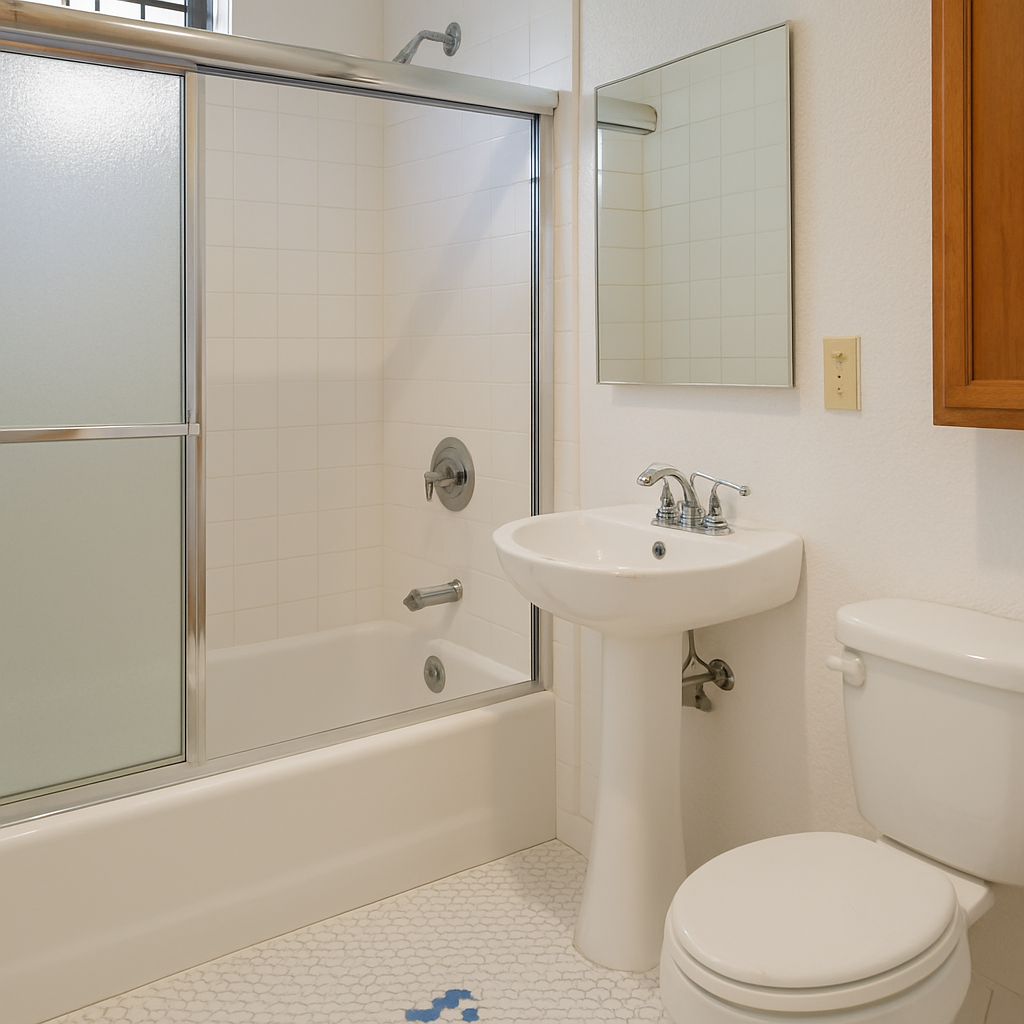 The bathroom keeps its vintage charm with hex-tile flooring, tub/shower combo with sliding glass doors, and a pedestal sink, blending old-world character with everyday functionality.