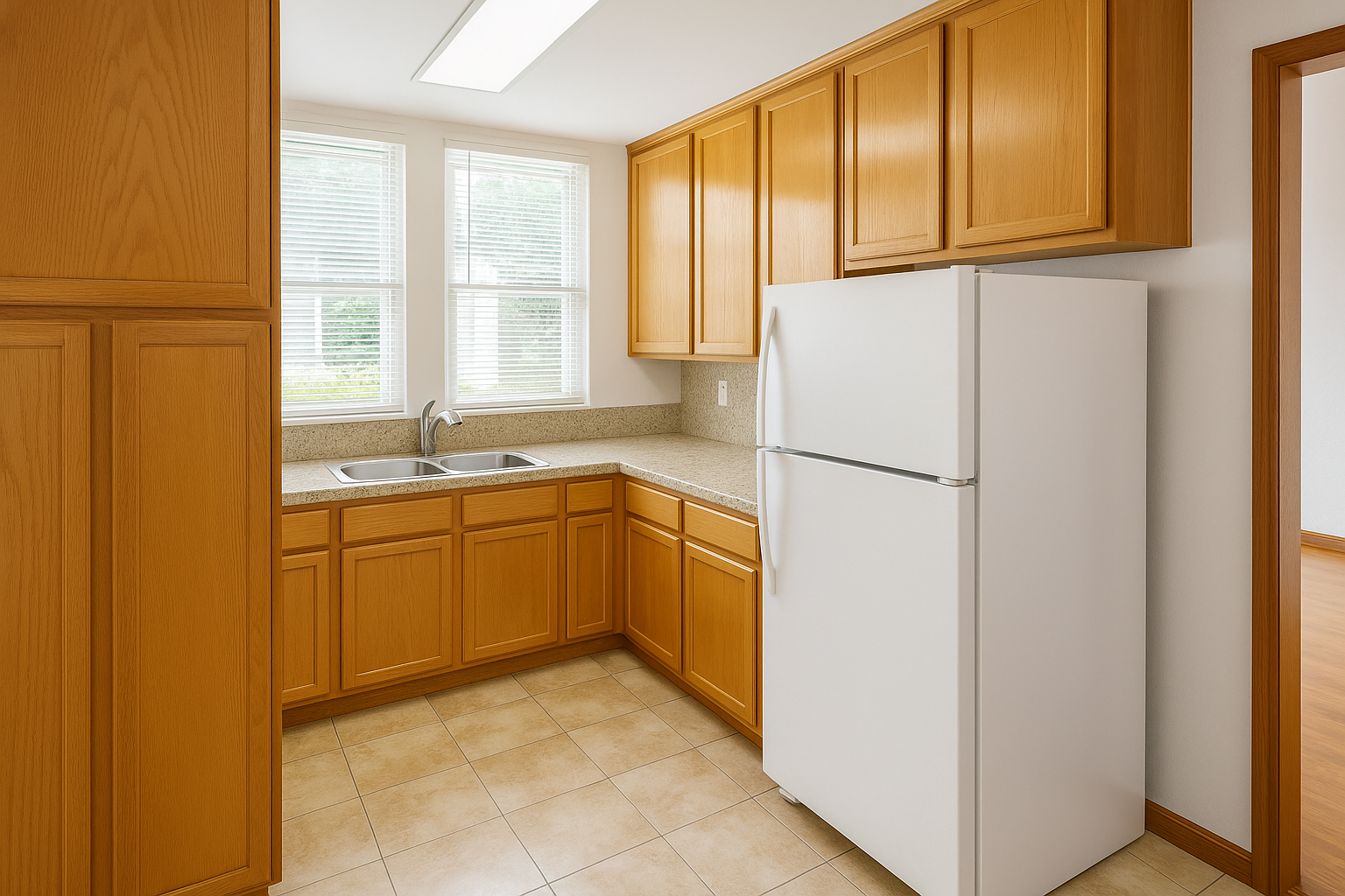 The separate, U-shaped kitchen offers plenty of cabinet and counter space and a window over the sink for extra light and ventilation. Just off the living area, you’ll find a comfortable bedroom with hardwood floors and neutral paint.